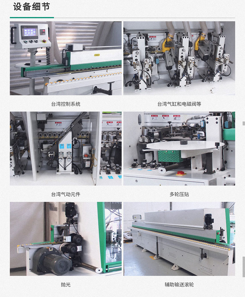 主要功能:涂膠貼邊,封邊切斷,前后齊頭,粗修,精修,刮邊,拋光。自動化對板材進行封邊處理。